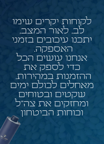 אנו מייצרים שמן כתית מעולה בכבישה קרה ושומרים על רמת חומציות של פחות מ- 0.5%, מרקם ייחודי וטעם משובח.